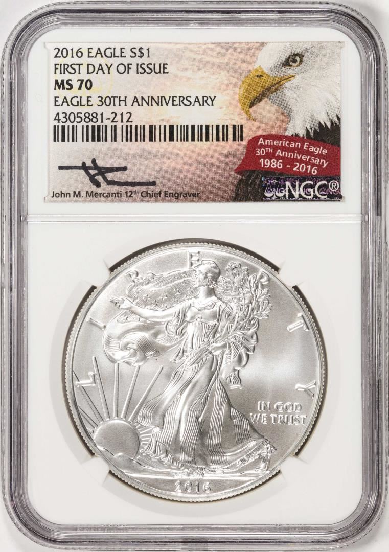 2016 $1 American Silver Eagle Coin NGC MS70 FDOI Mercanti Signature 30th Anniversary