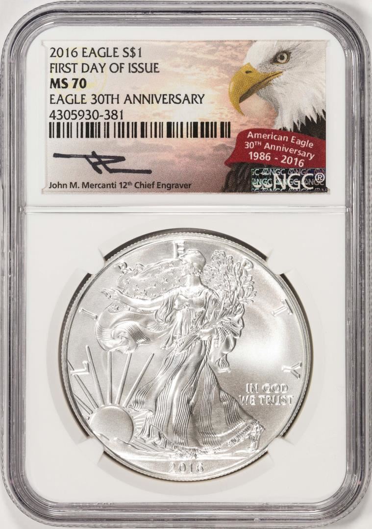 2016 $1 American Silver Eagle Coin NGC MS70 FDOI Mercanti Signature 30th Anniversary
