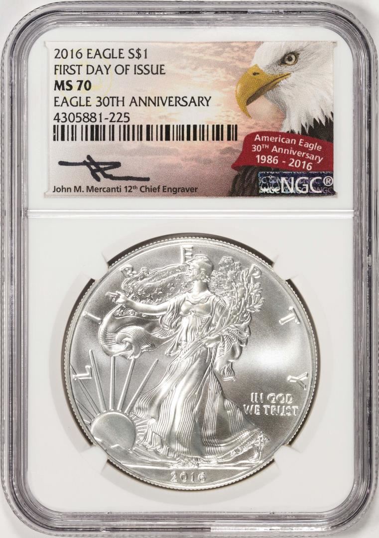 2016 $1 American Silver Eagle Coin NGC MS70 FDOI Mercanti Signature 30th Anniversary