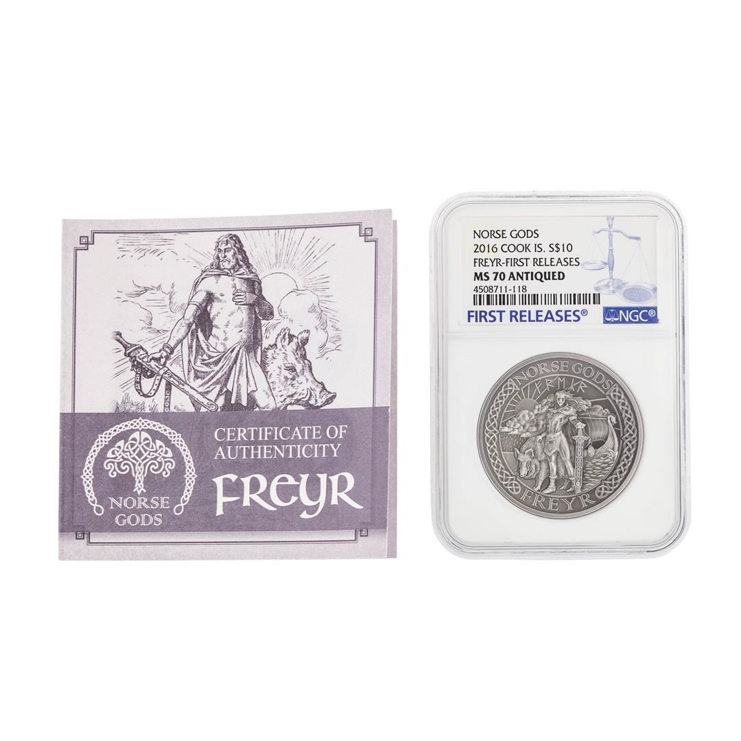 One 2016 $10 Cook Islands Norse Gods Freyr Silver Coin NGC MS70 Antiqued. NGC Certified.