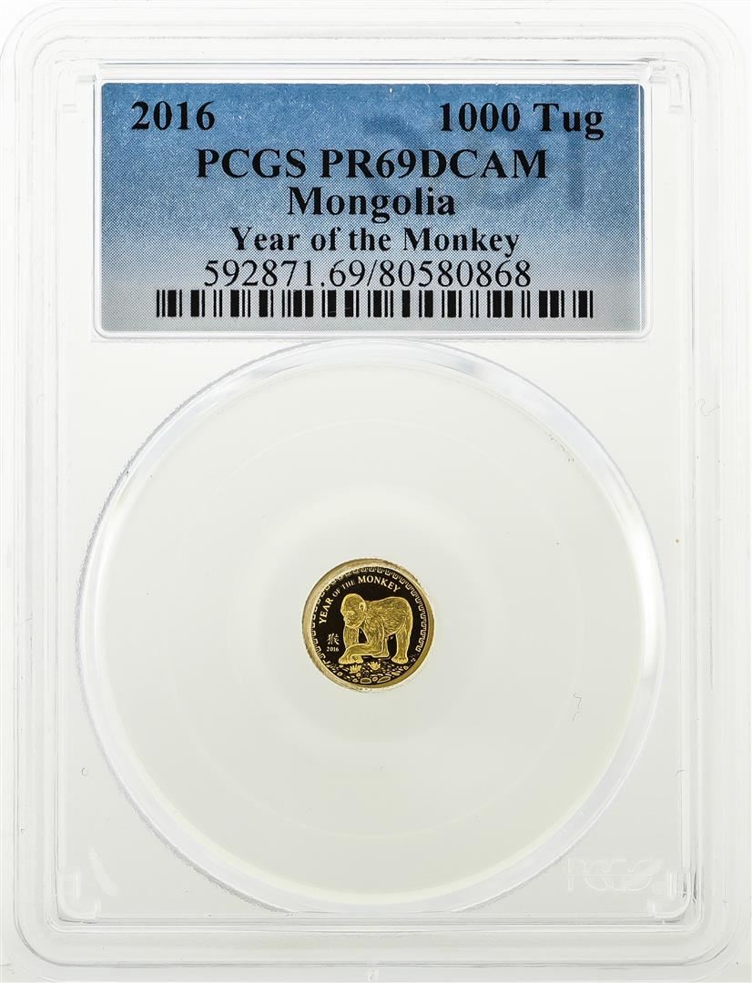 One 2016 1000 Tug Mongolia Year of the Monkey Gold Coin PCGS PR69DCAM. PCGS Graded.