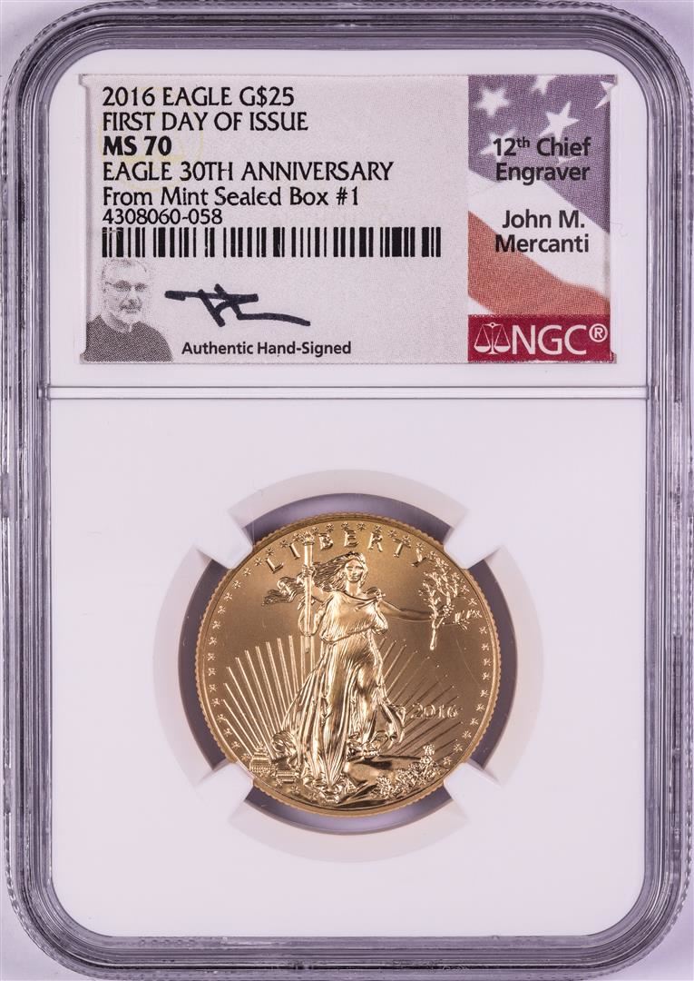 One 2016 $25 American Gold Eagle Coin NGC MS70 First Day of Issue Mercanti Signature. NGC Certified.