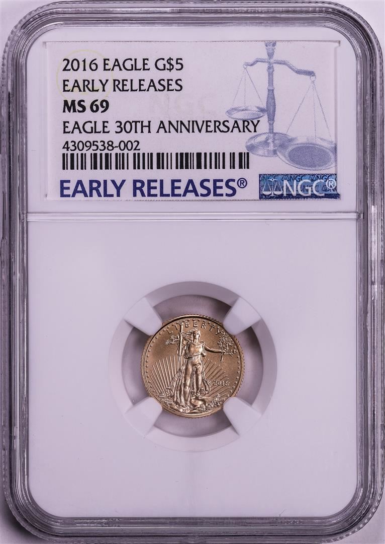 One 2016 $5 American Gold Eagle Coin NGC MS69 Early Releases. NGC Certified.