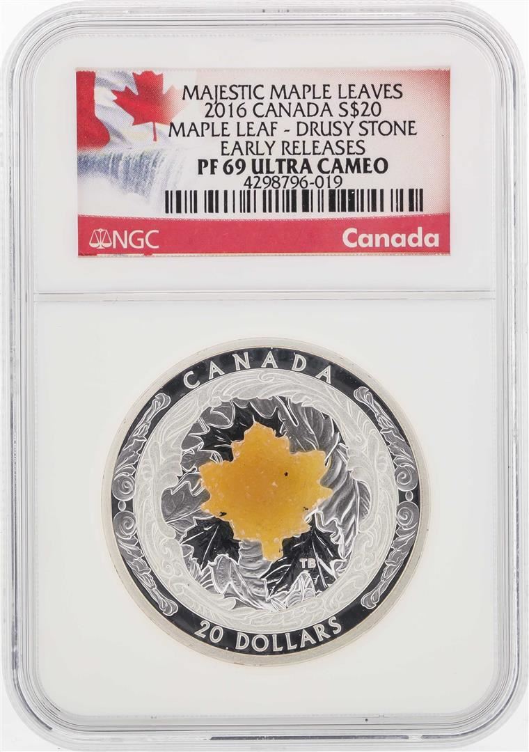 One 2016 Canada $20 Maple Leaf Drusy Stone Silver Coin NGC PF69 Ultra Cameo. NGC Certified.