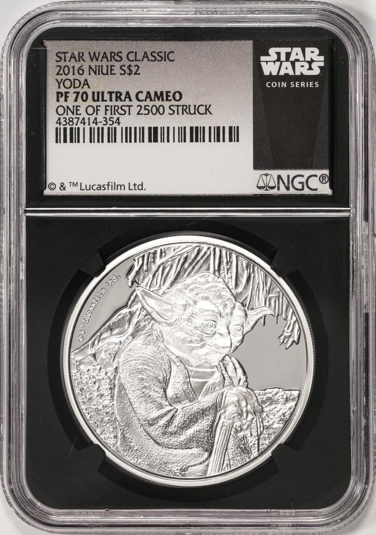 One 2016 Niue $2 Proof Star Wars Yoda Silver Coin NGC PF70 UC One of First 2500 Struck . NGC Certified.