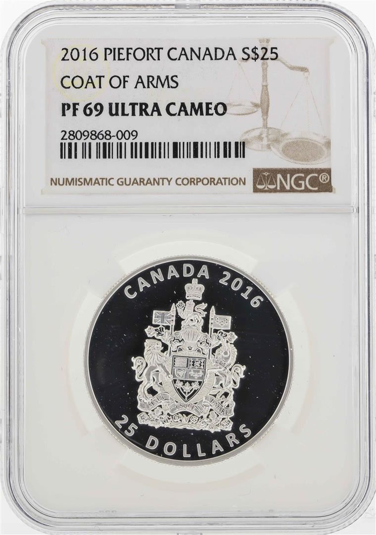 One 2016 Piefort Canada $25 Coat of Arms Silver Coin NGC PF69 Ultra Cameo. NGC Certified.