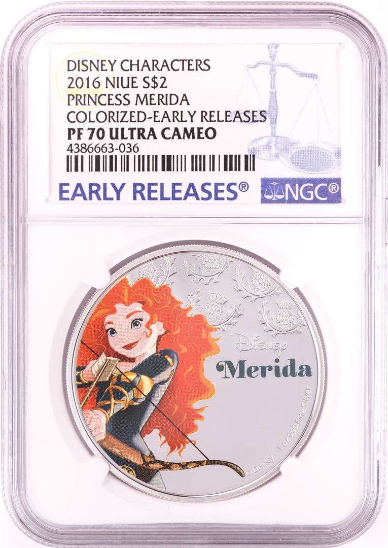 One 2016 Proof $2 Disney Princess Merida 1oz Silver Coin NGC PF70 Ultra Cameo. NGC Certified.