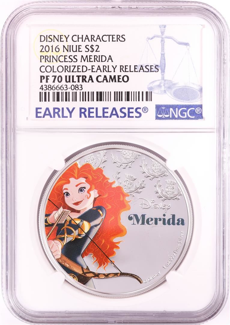 One 2016 Proof $2 Disney Princess Merida 1oz Silver Coin NGC PF70 Ultra Cameo. NGC Certified.