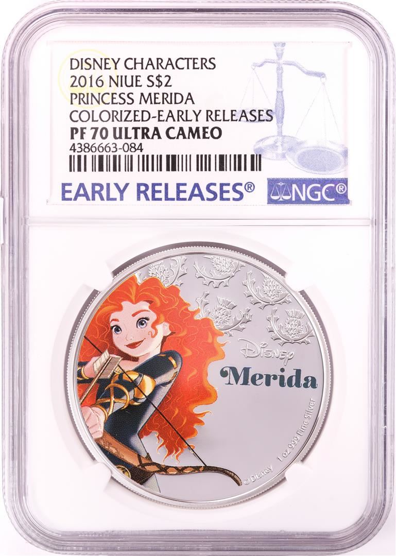 One 2016 Proof $2 Disney Princess Merida 1oz Silver Coin NGC PF70 Ultra Cameo. NGC Certified.