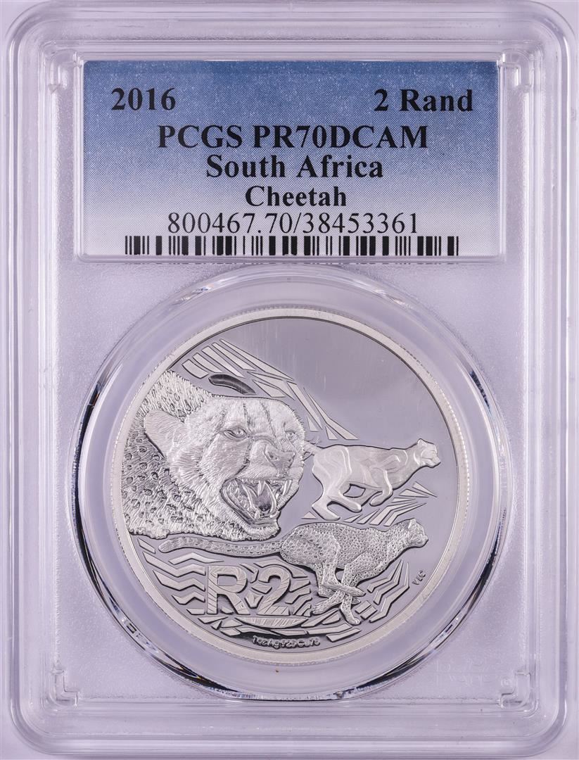 One 2016 Proof South Africa 2 Rand Cheetah Silver Coin PCGS PR70DCAM. PCGS Graded.