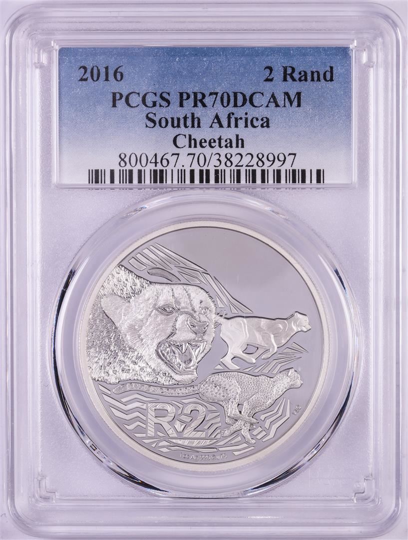 One 2016 Proof South Africa 2 Rand Cheetah Silver Coin PCGS PR70DCAM. PCGS Graded.