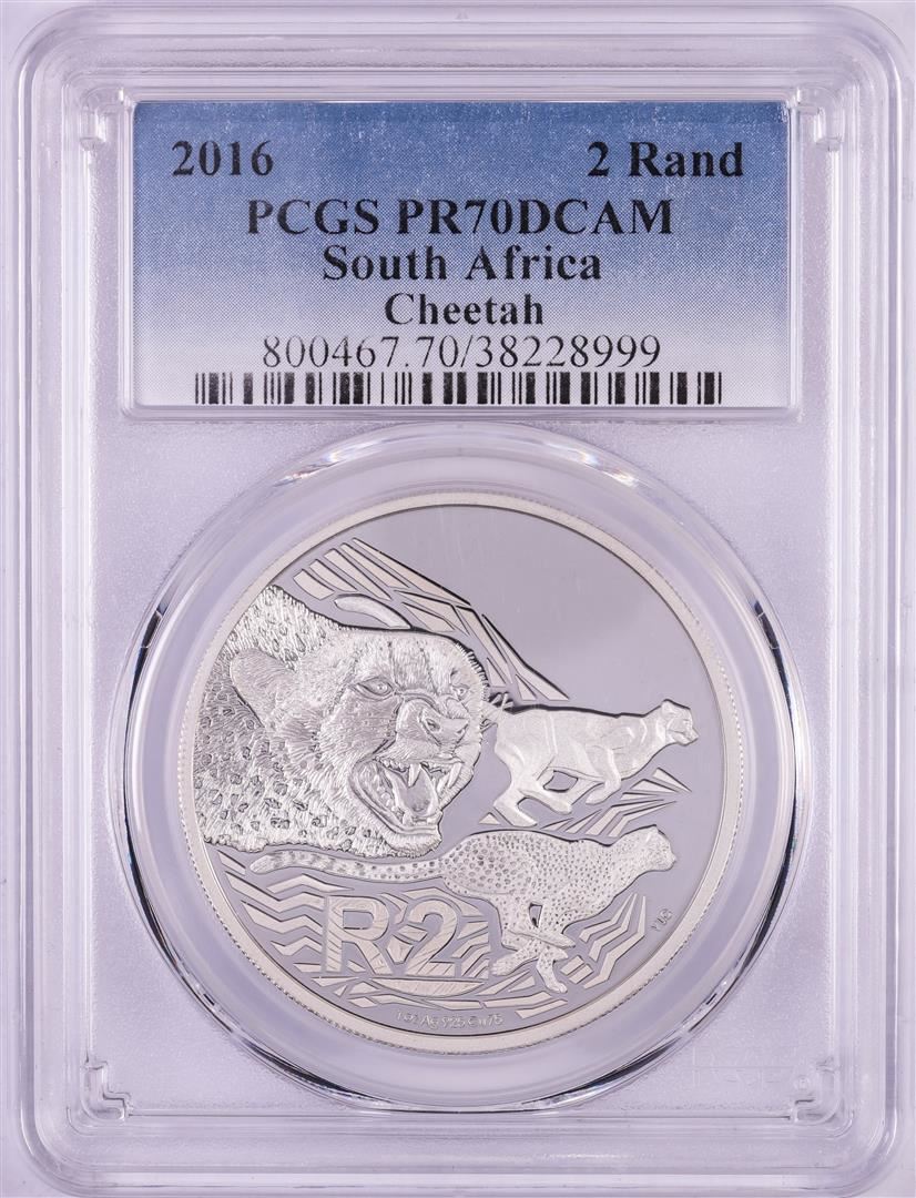 One 2016 Proof South Africa 2 Rand Cheetah Silver Coin PCGS PR70DCAM. PCGS Graded.