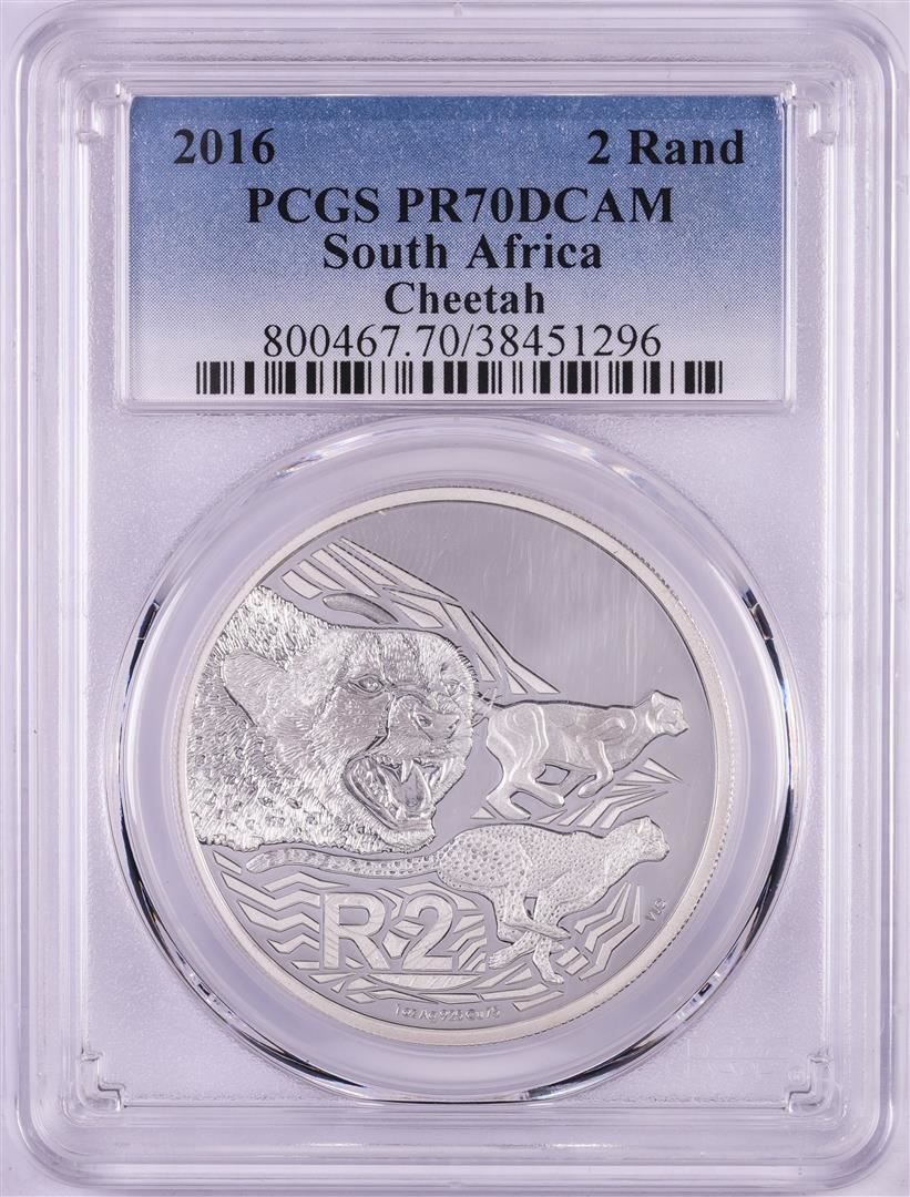 One 2016 Proof South Africa 2 Rand Cheetah Silver Coin PCGS PR70DCAM. PCGS Graded.