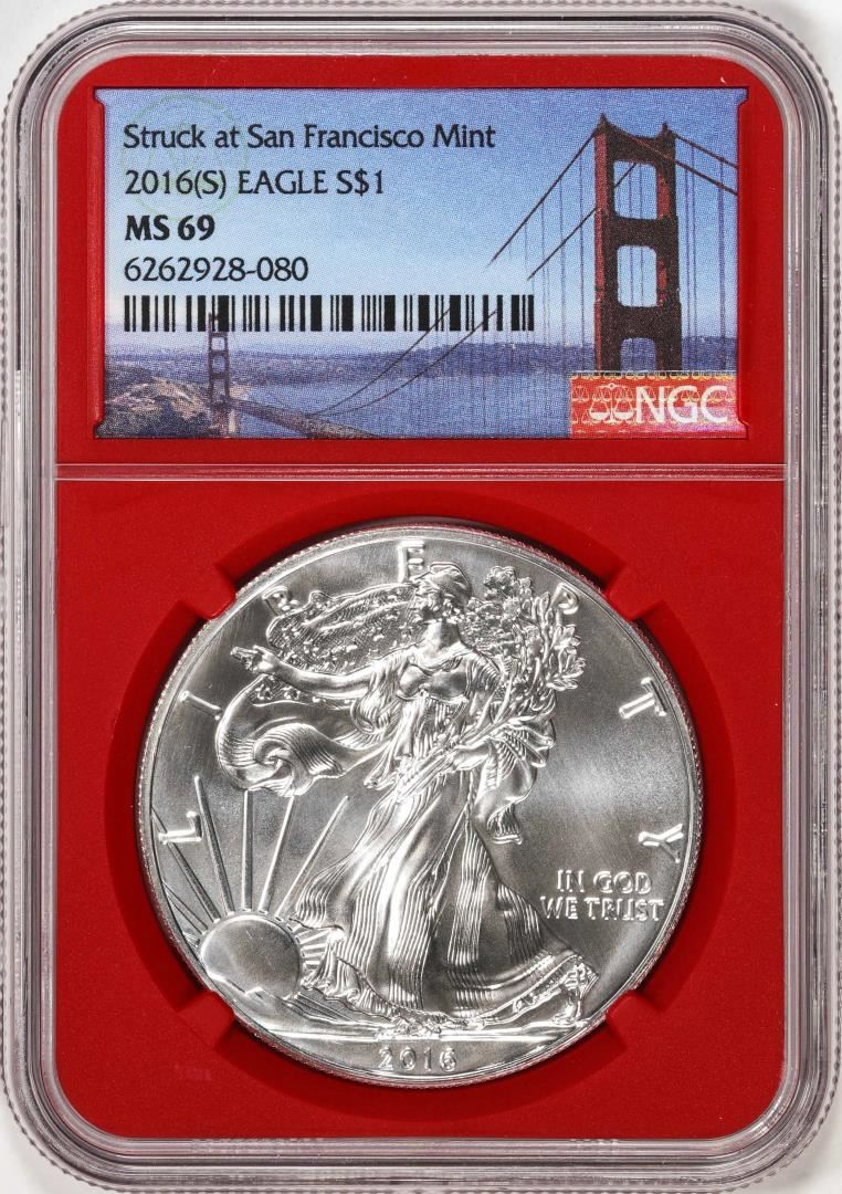 One 2016-(S) $1 American Silver Eagle Coin NGC MS69 Struck at San Francisco Red Core. NGC Certified.