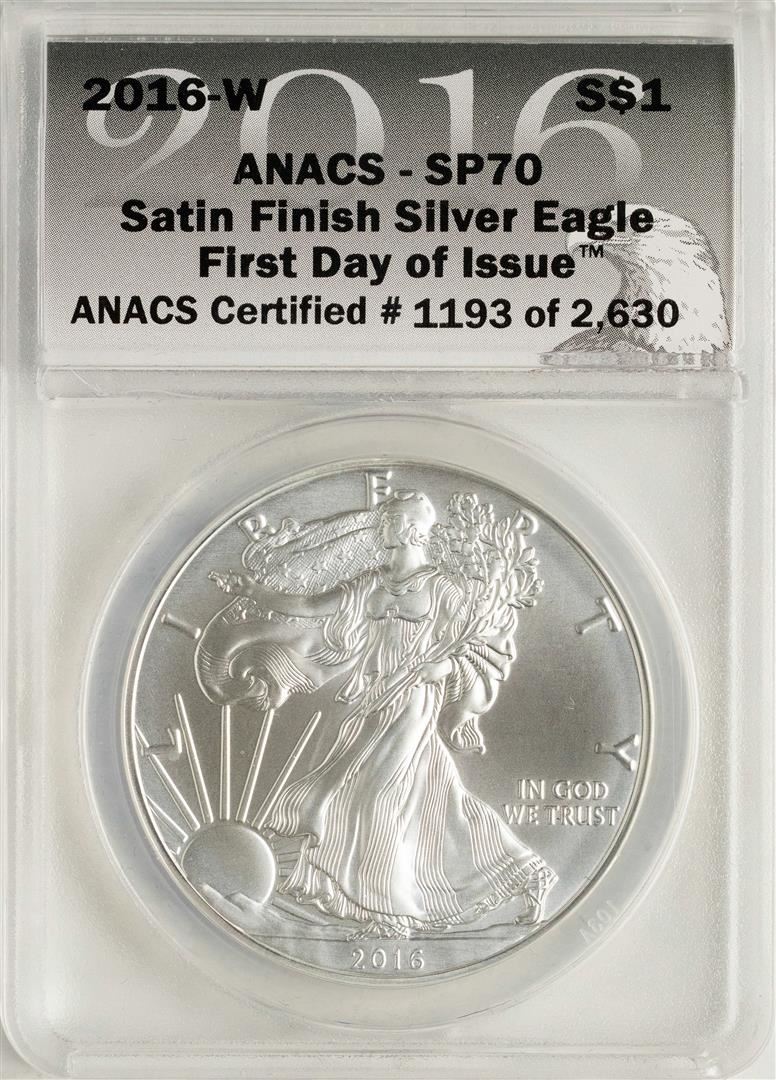 One 2016-W $1 American Silver Eagle Coin Satin Finish ANACS SP70 First Day of Issue. ANACS Certified.