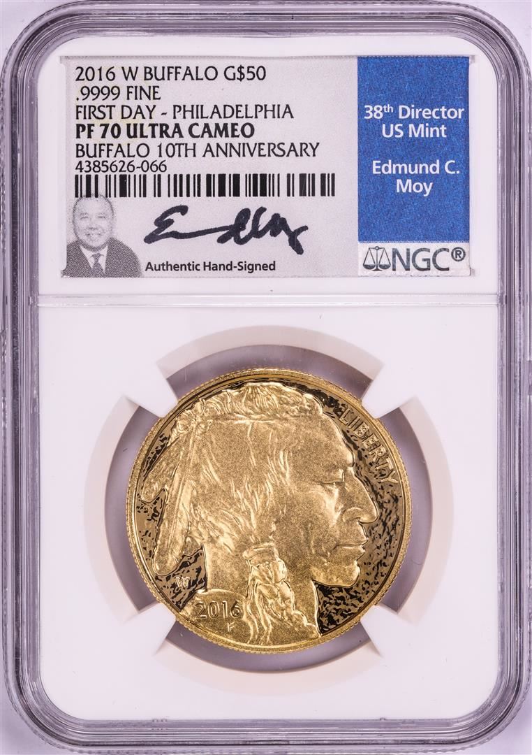 One 2016-W $50 Proof American Buffalo Gold Coin NGC PF70 First Day Moy Signature Phil.. NGC Certified.