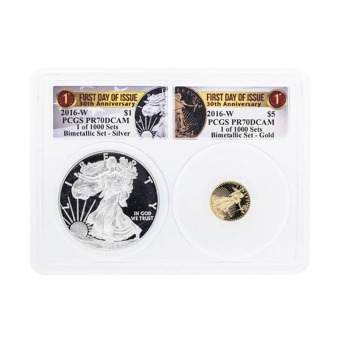 One 2016-W American Silver & Gold Eagle 30th Anniversary Proof Bimetallic Set PCGS PR70DCAM. PCGS Graded.