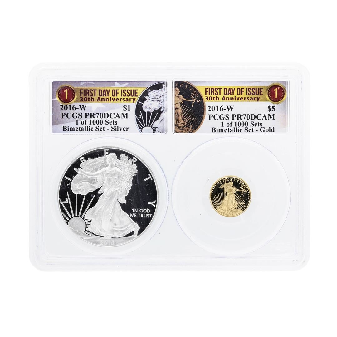 One 2016-W American Silver & Gold Eagle 30th Anniversary Proof Bimetallic Set PCGS PR70DCAM. PCGS Graded.
