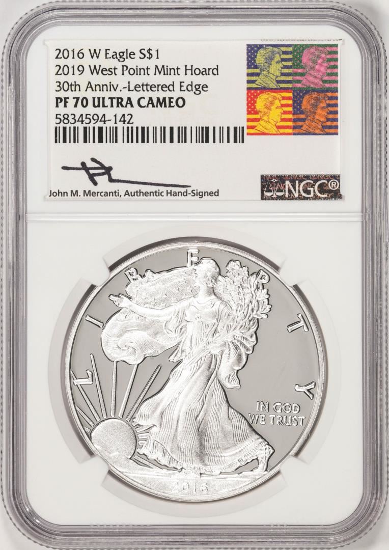 2016-W Lettered Edge $1 Proof American Silver Eagle Coin NGC PF70 UC Mercanti Signed