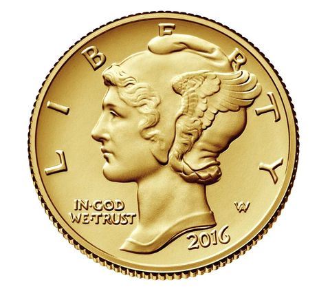 Introducing the 2016 Mercury Dime Centennial Gold Coin. This is an event 100 years in the making. Beautifully struck in .9999 fine 24-karat gold, the Mercury Dime Centennial Gold Coin features Adolph A. Weinman's original Winged Liberty design. This gold dime coin is commonly referred to as the Mercury Dime because of Liberty's resemblance to the Roman god. Each coin contains one-tenth troy ounce of 24-karat gold, symbolic of the coin's denomination of one dime, and is struck with a business strike finish. The obverse (heads) features a portrait of Liberty facing left, wearing a winged cap, with the inscriptions "LIBERTY," "IN GOD WE TRUST," "2016" and the artist's initials, "AW." The reverse (tails) includes a Roman fasces and an olive branch, symbolizing America's military readiness and desire for peace. Inscriptions are "UNITED STATES OF AMERICA," "E PLURIBUS UNUM," "AU 24K," "1/10 oz.," and "ONE DIME." Each coin is encapsulated and hand packaged in a custom-designed, black-matte hardwood presentation case and accompanied by a Certificate of Authenticity.