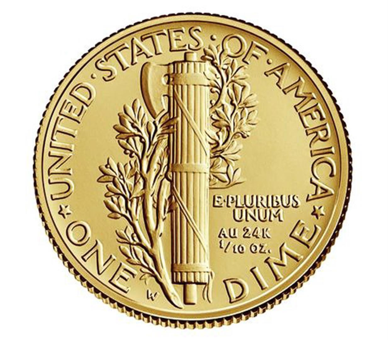 Introducing the 2016 Mercury Dime Centennial Gold Coin. This is an event 100 years in the making. Beautifully struck in .9999 fine 24-karat gold, the Mercury Dime Centennial Gold Coin features Adolph A. Weinman's original Winged Liberty design. This gold dime coin is commonly referred to as the Mercury Dime because of Liberty's resemblance to the Roman god. Each coin contains one-tenth troy ounce of 24-karat gold, symbolic of the coin's denomination of one dime, and is struck with a business strike finish. The obverse (heads) features a portrait of Liberty facing left, wearing a winged cap, with the inscriptions "LIBERTY," "IN GOD WE TRUST," "2016" and the artist's initials, "AW." The reverse (tails) includes a Roman fasces and an olive branch, symbolizing America's military readiness and desire for peace. Inscriptions are "UNITED STATES OF AMERICA," "E PLURIBUS UNUM," "AU 24K," "1/10 oz.," and "ONE DIME." Each coin is encapsulated and hand packaged in a custom-designed, black-matte hardwood presentation case and accompanied by a Certificate of Authenticity.