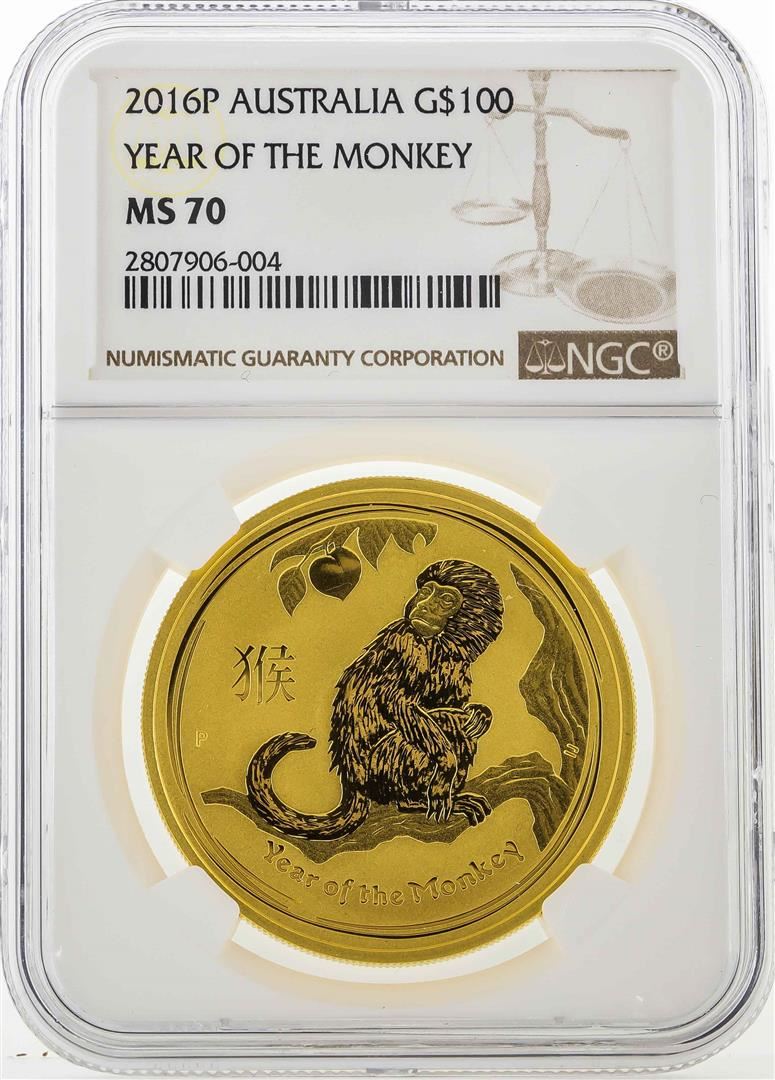 One 2016P Australia $100 Year of the Monkey Gold Coin NGC MS70. NGC Certified.