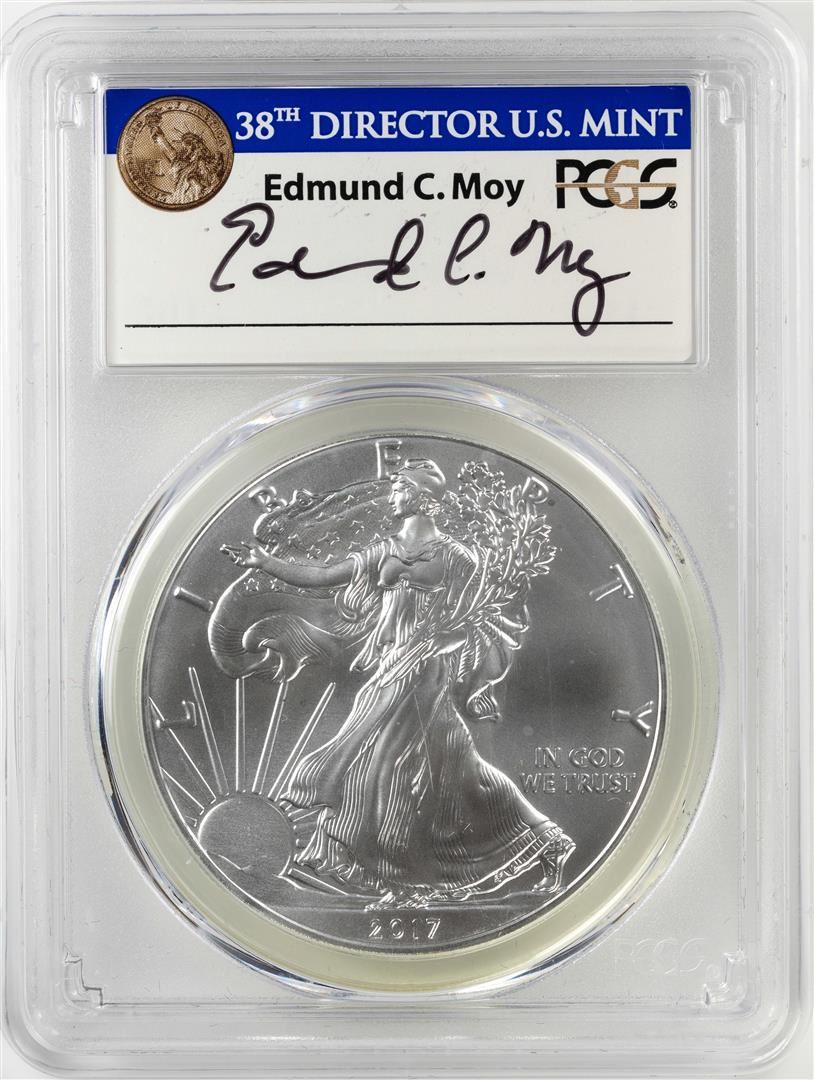 One 2017 $1 American Silver Eagle Coin PCGS MS70 First Day of Issue Moy Signature. PCGS Graded.