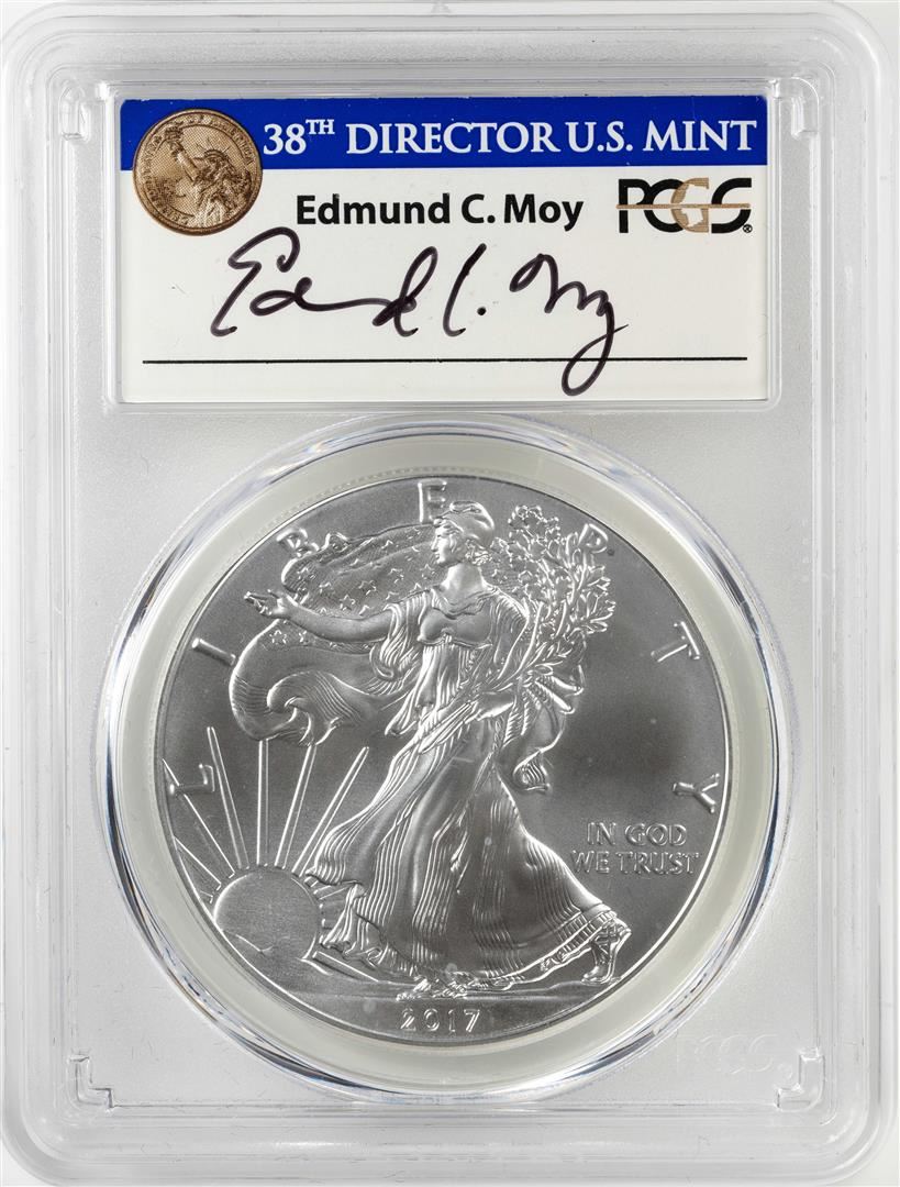 One 2017 $1 American Silver Eagle Coin PCGS MS70 First Day of Issue Moy Signature. PCGS Graded.