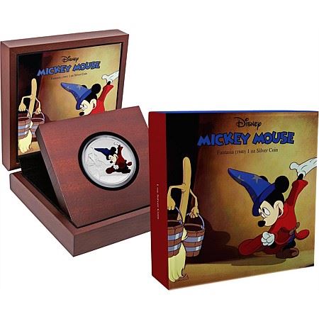 One 2017 1 oz Silver $2 Mickey Through the Ages: Fantasia. This coin is the fourth in the "Mickey Through the Ages" coin collection celebrating the much-loved Disney character, Mickey Mouse, and his cartoon career throughout the decades. Contains 1 oz of .999 fine Silver in a wooden presentation box with a certificate of authenticity. Limited mintage of 10,000 globally. Obverse: Features the Ian Rank-Broadley likeness of her Majesty Queen Elizabeth II surrounded by the country and face value. Reverse: Features a classic engraved image of Mickey Mouse as the Sorcerer's apprentice as seen in the Disney animation "Fantasia" 1940.