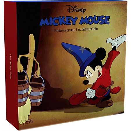One 2017 1 oz Silver $2 Mickey Through the Ages: Fantasia. This coin is the fourth in the "Mickey Through the Ages" coin collection celebrating the much-loved Disney character, Mickey Mouse, and his cartoon career throughout the decades. Contains 1 oz of .999 fine Silver in a wooden presentation box with a certificate of authenticity. Limited mintage of 10,000 globally. Obverse: Features the Ian Rank-Broadley likeness of her Majesty Queen Elizabeth II surrounded by the country and face value. Reverse: Features a classic engraved image of Mickey Mouse as the Sorcerer's apprentice as seen in the Disney animation "Fantasia" 1940.