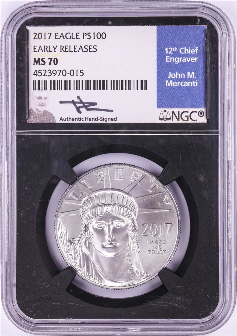 One 2017 $100 Platinum American Eagle Coin NGC MS70 Early Releases Mercanti Signature. NGC Certified.