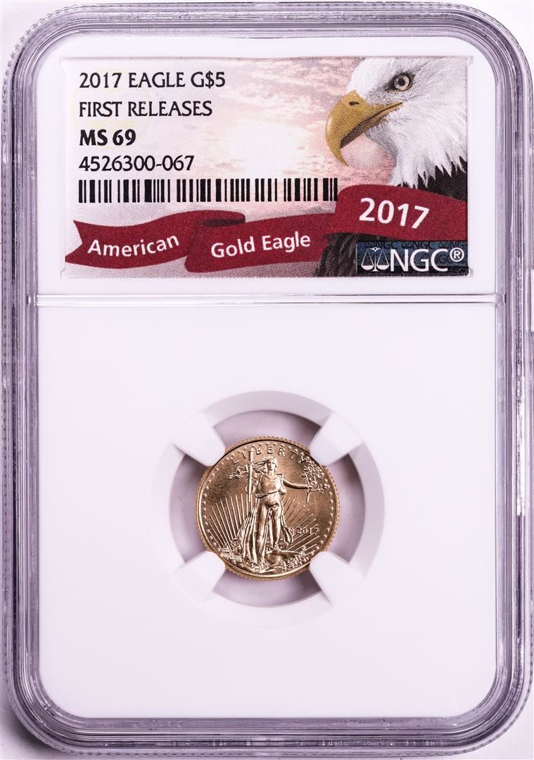 One 2017 $5 American Gold Eagle Coin NGC MS69 First Releases. NGC Certified.