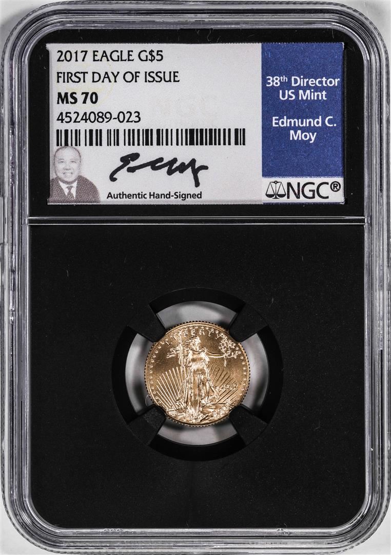 2017 $5 American Gold Eagle Coin NGC MS70 FDOI Moy Signature