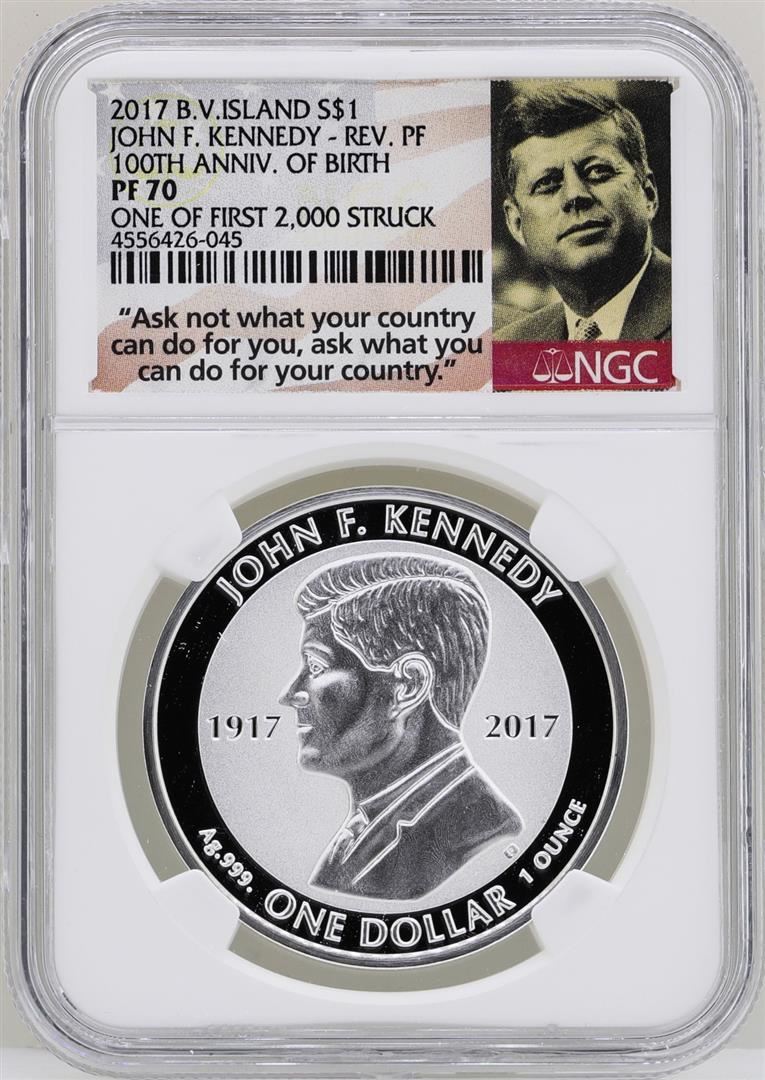 One 2017 British Virgin Islands $1 John F. Kennedy Reverse Proof Coin NGC PF70. NGC Certified.