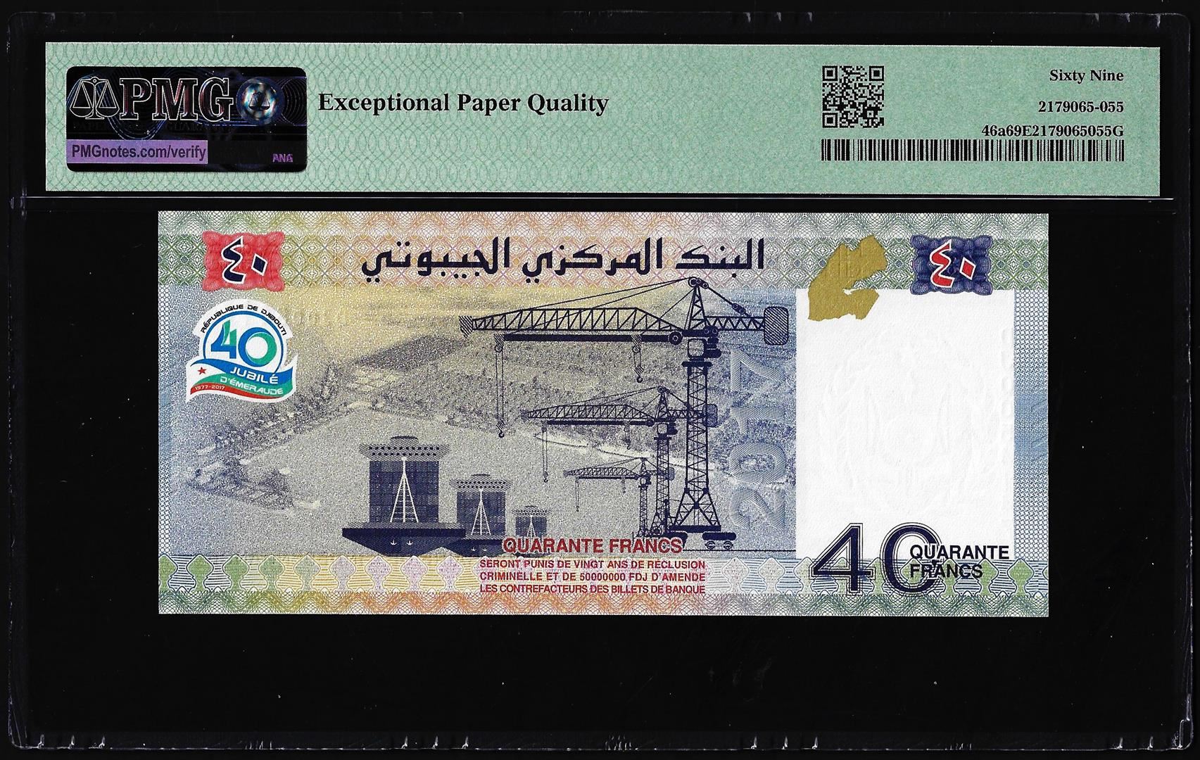 One 2017 Djibouti Central Bank 40 Francs Note Pick# 46a PMG Superb Gem Uncirculated 69EPQ. PMG Certified.