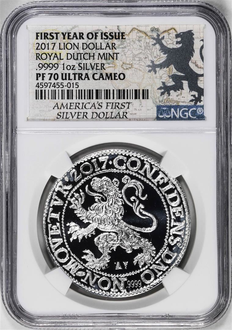 One 2017 Netherlands Proof Lion Dollar Restrike Silver Coin NGC PF70 Ultra Cameo FYOI. NGC Certified.
