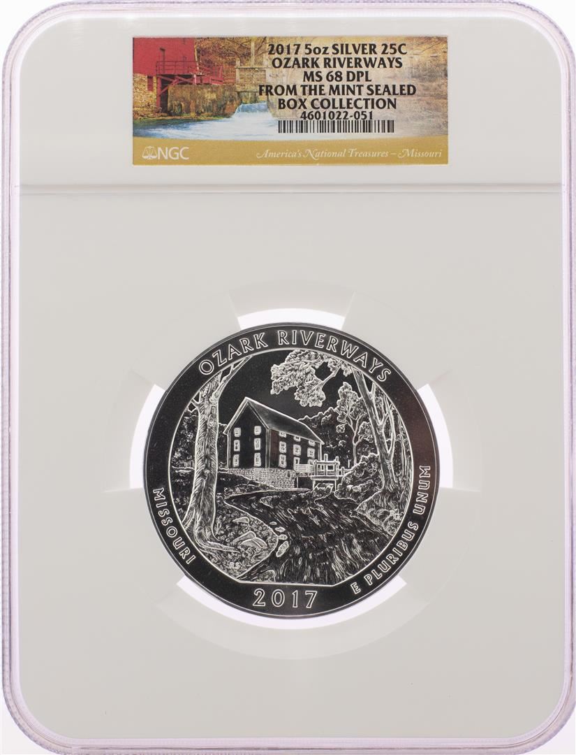 2017 Ozark Riverways ATB 5oz Silver Quarter Coin NGC MS68 DPL from Mint Sealed