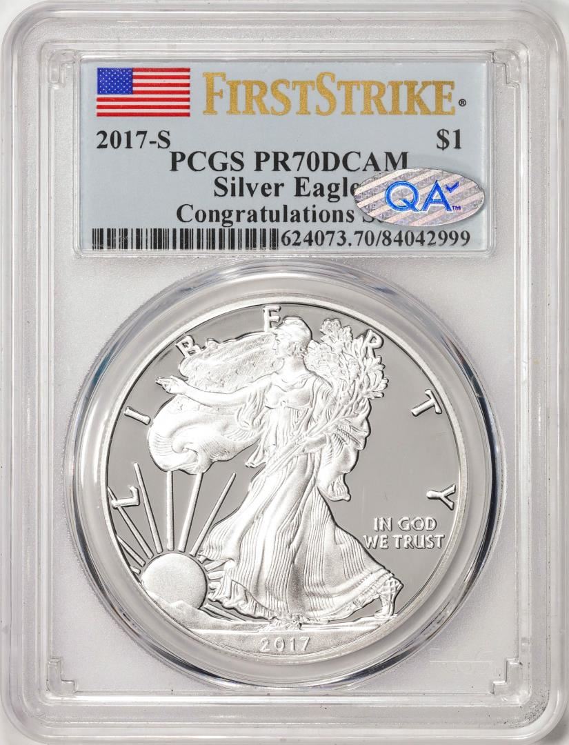 One 2017-S $1 Proof American Silver Eagle Coin PCGS PR70DCAM Congratulations Set. PCGS Graded.