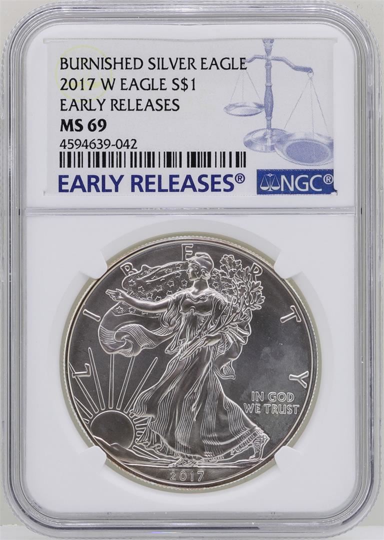 One 2017-W $1 Burnished American Silver Eagle Coin NGC MS69 Early Releases. NGC Certified.