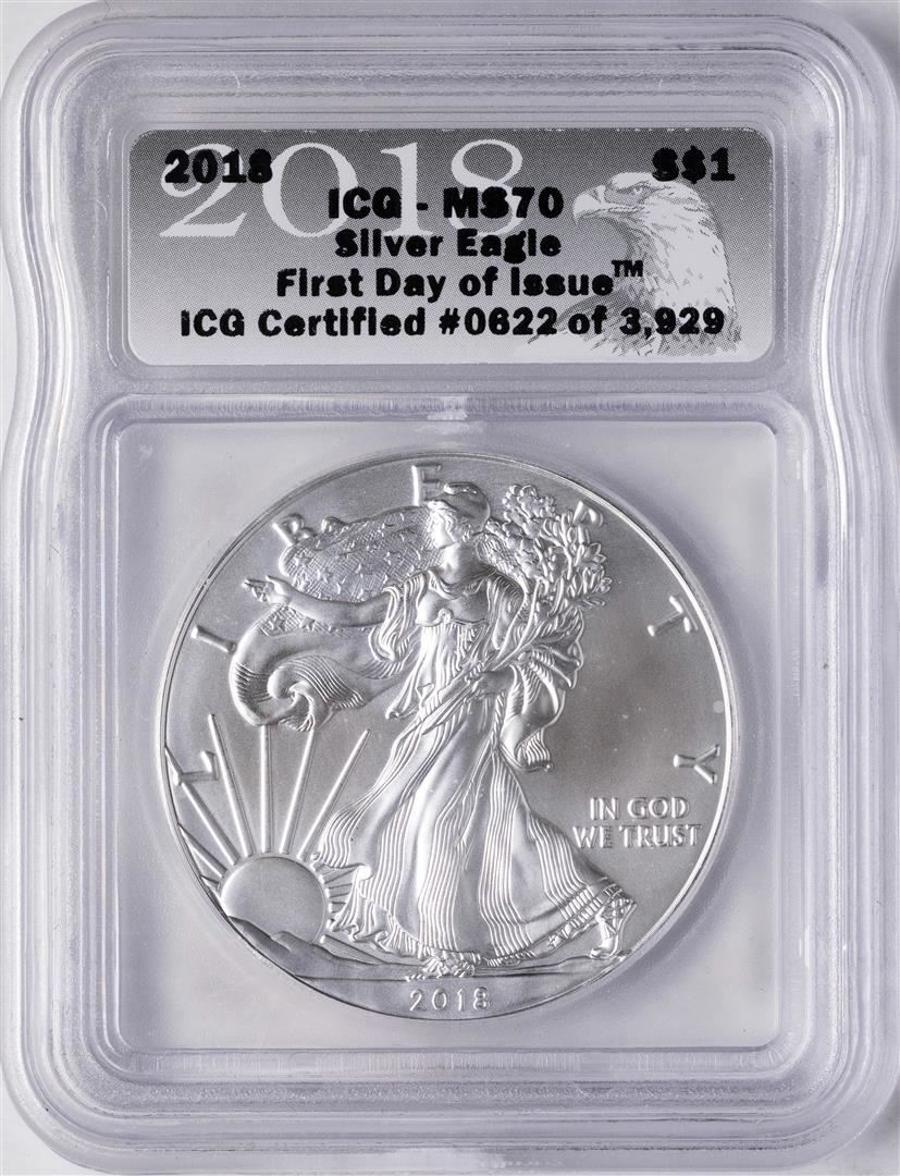 2018 $1 American Silver Eagle Coin ICG MS70 First Day of Issue