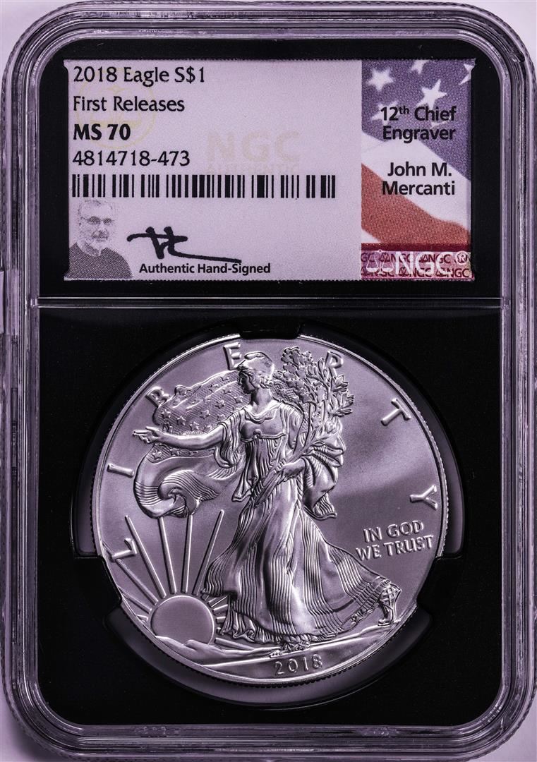 2018 $1 American Silver Eagle Coin NGC MS70 First Releases Mercanti Signature