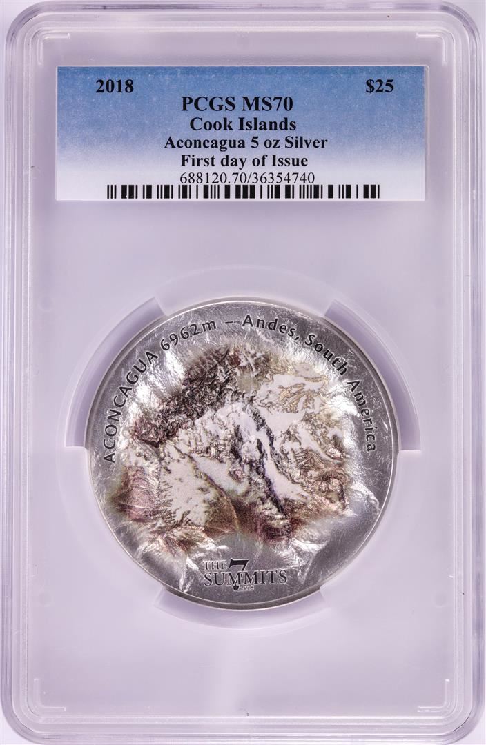 One 2018 $25 Cook Islands Aconcagua 5oz Silver Coin PCGS MS70 First Day of Issue. PCGS Graded.