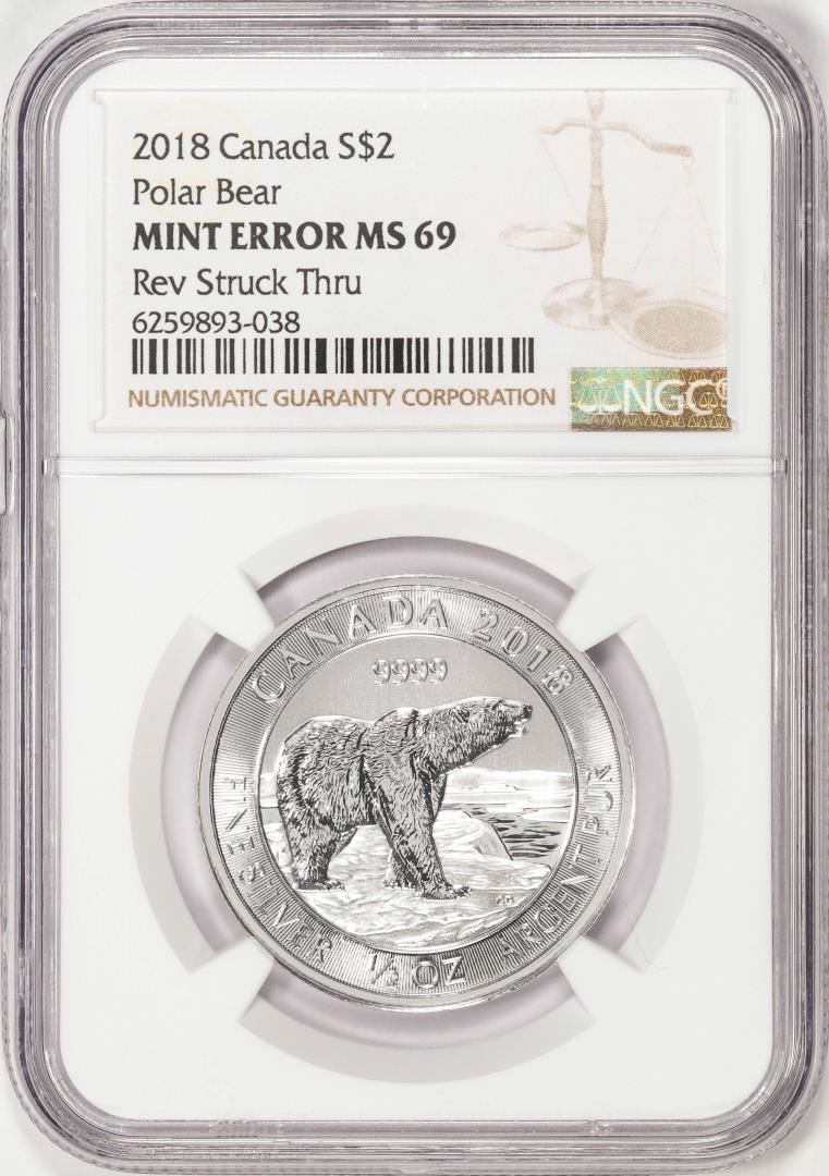 2018 Canada $2 Polar Bear Silver Coin NGC Mint Error Reverse Struck Thru MS69