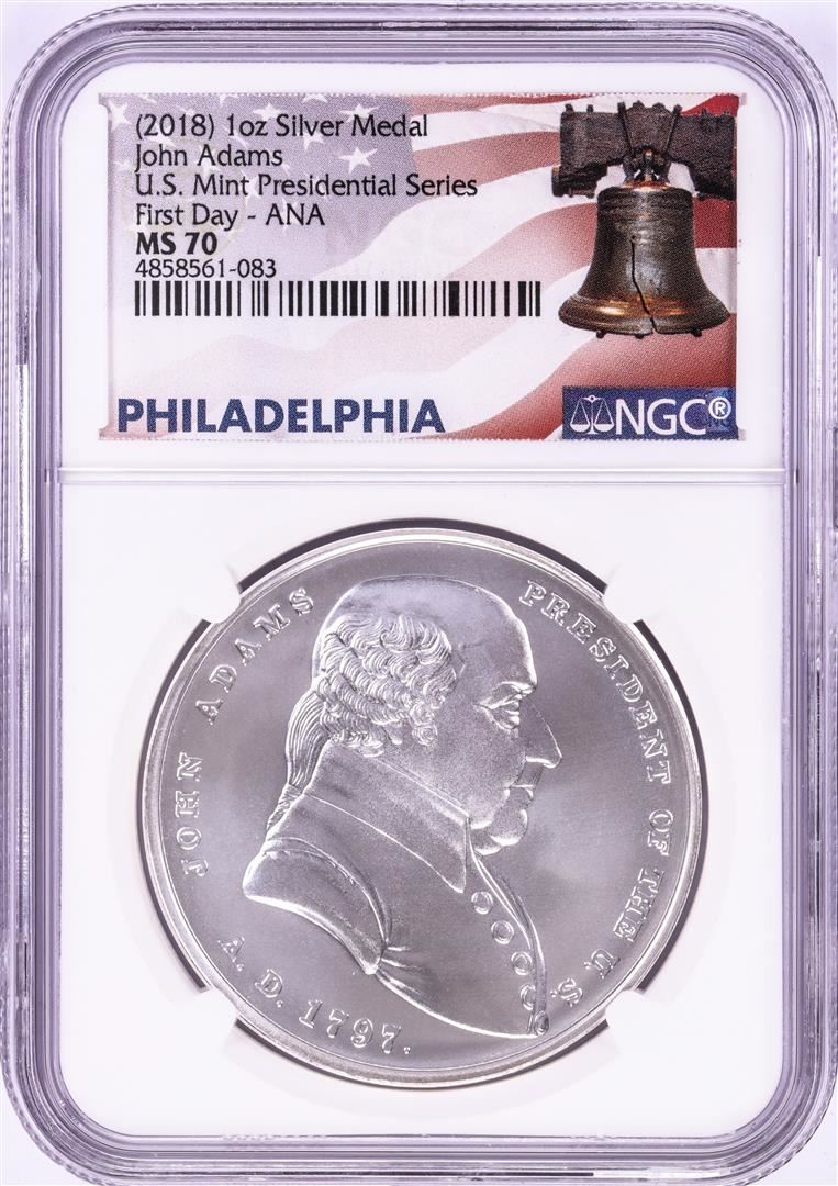 One 2018 John Adams Silver Presidential Medal NGC MS70 First Day ANA. NGC Certified.