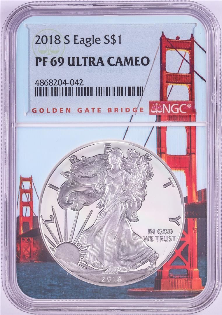 2018-S $1 Proof American Silver Eagle Coin NGC PF69 Ultra Cameo Bridge Core