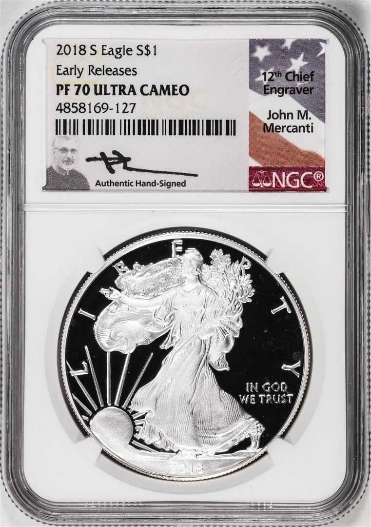 2018-S $1 Proof American Silver Eagle Coin NGC PF70 Ultra Cameo ER Mercanti Signature