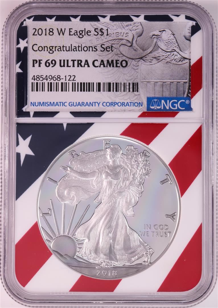 2018-W $1 Proof American Silver Eagle Coin NGC PF69 Ultra Cameo Congratulations Flag