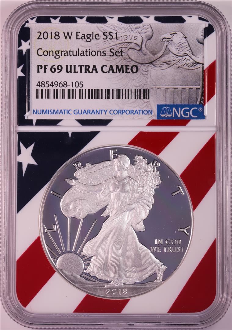 2018-W $1 Proof American Silver Eagle Coin NGC PF69 Ultra Cameo Congratulations Flag