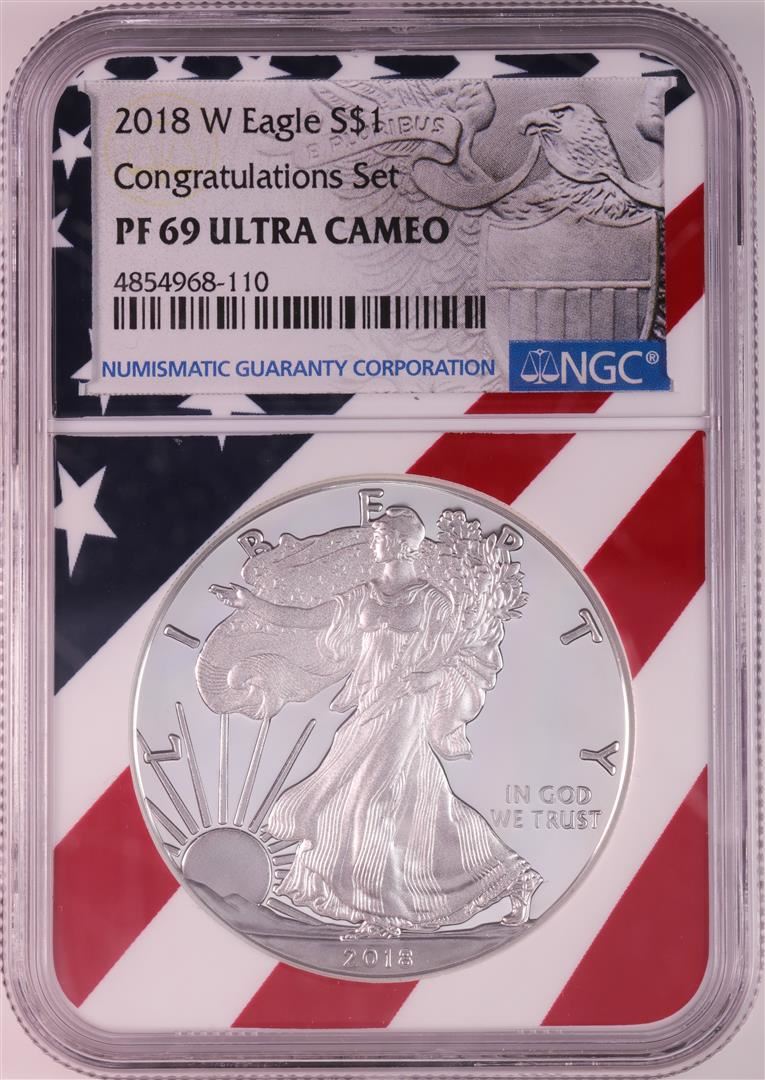 2018-W $1 Proof American Silver Eagle Coin NGC PF69 Ultra Cameo Congratulations Flag