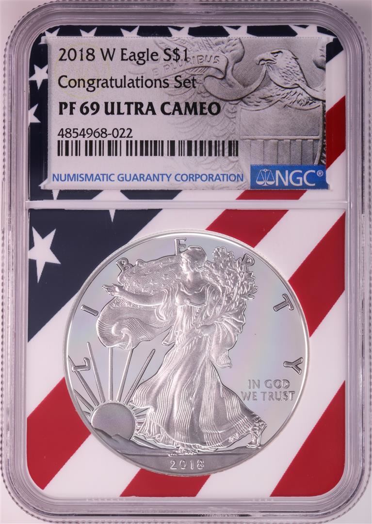 2018-W $1 Proof American Silver Eagle Coin NGC PF69 Ultra Cameo Congratulations Flag